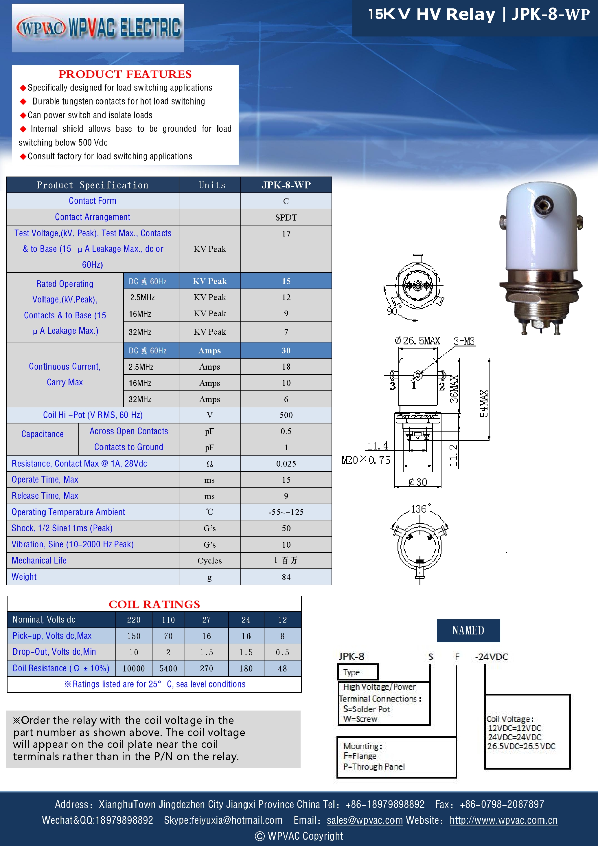 JPK-8-WP HV vacuum relay for make-and-break load switching DC15KV